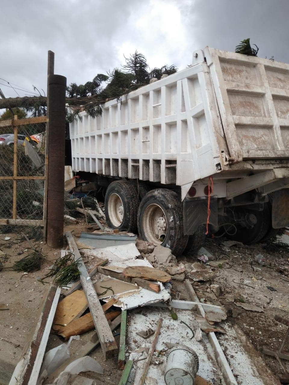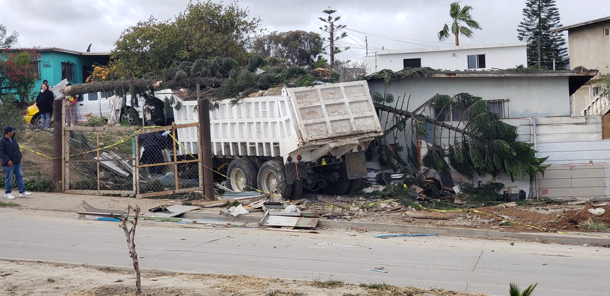 El silencio es sepulcral en este boluverd de tanta afluencia vial, los vecinos miran asombrados y con un gesto de susto. Se ven carros volteados, compactados, golpeados, una motocicleta destrozada, todo huele a desgracia y se siente la perdida. Damos unos cuantos pasos más y ahí esta el causante de tanto daño, un “dompe de volteo” metido por completo en el pequeño patio de una casita donde un pino actuó como el más fiel guardian deteniendo como fuera el avance destructivo del camión pero dejando su forma de vida en este plano terrestre.