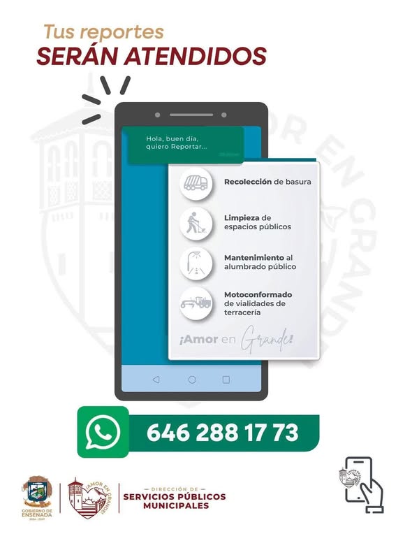 AsombrosoLogros Ciudadanos Nuestro compromiso mejores servicios públicos June 18, 2025 Coudermann Recuerda que en la línea de WhatsApp 646 288 17 73, puedes reportar -vía mensaje- fallas en el servicio de recolección de basura, en el alumbrado y/o solicitar motoconformado de vialidades, limpieza de espacios públicos. ¡Servicios públicos con Amor en Grande! #XXVAyuntamiento #ClaudiaAgatón #ServiciosPúblicos #AmorEnGrande Facebook Comments